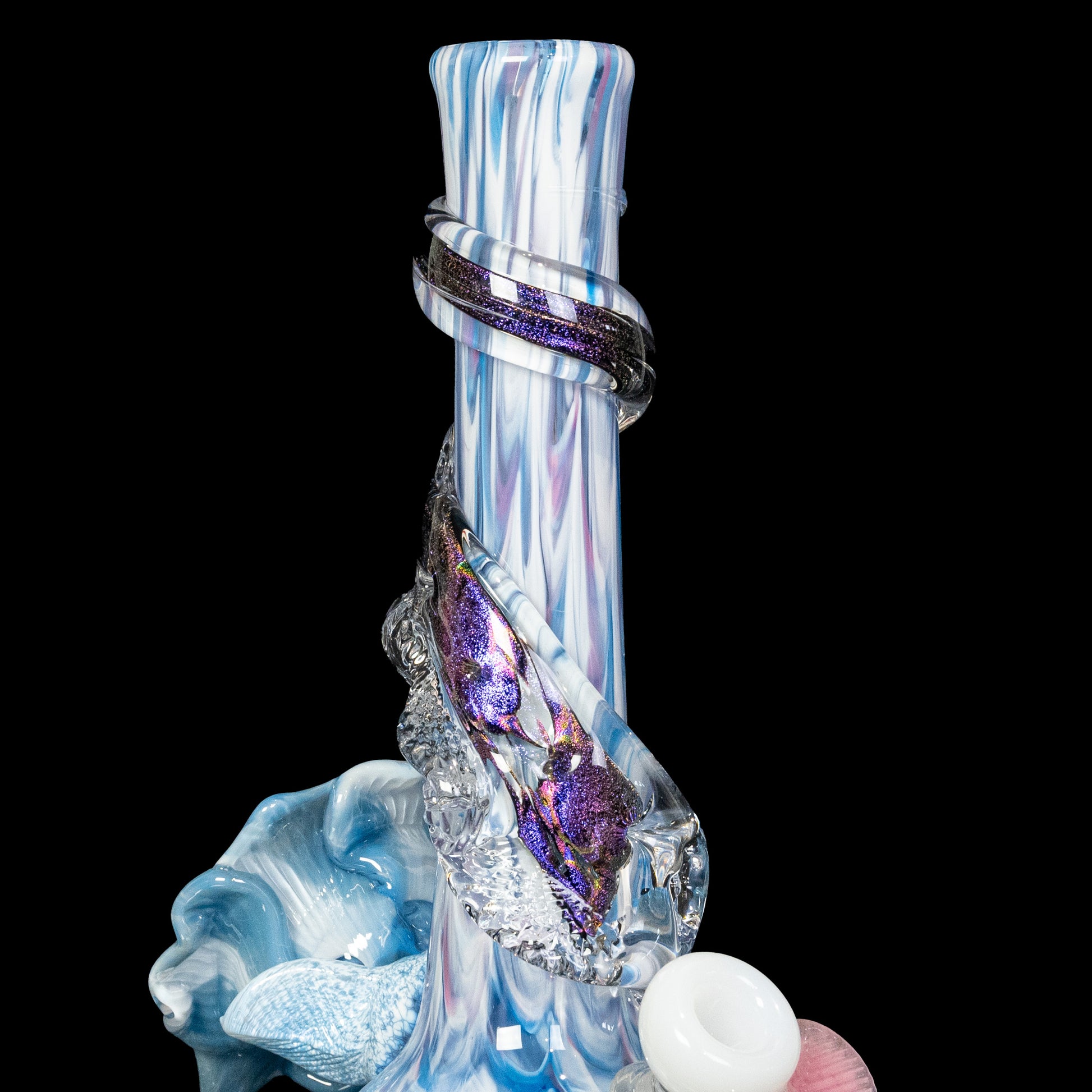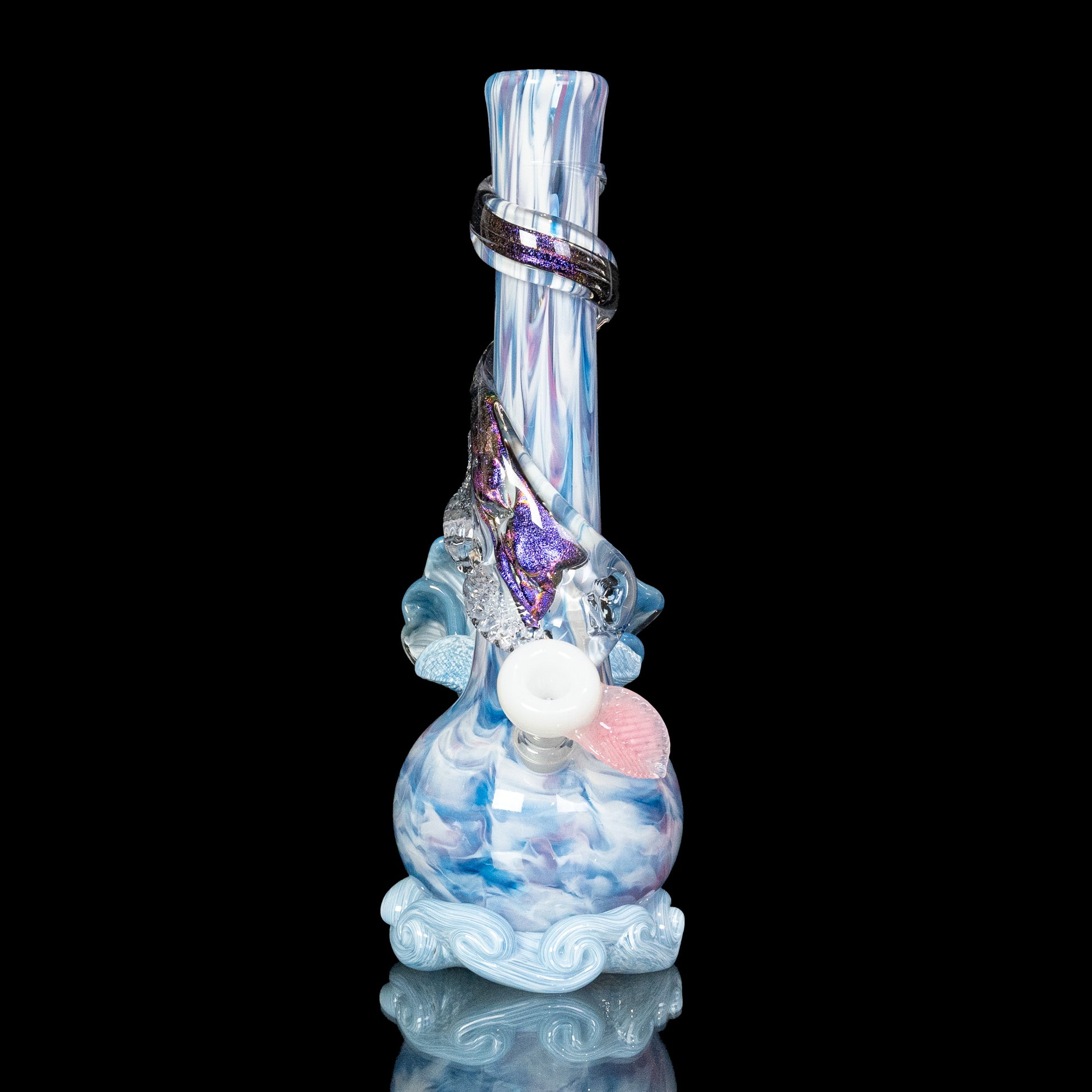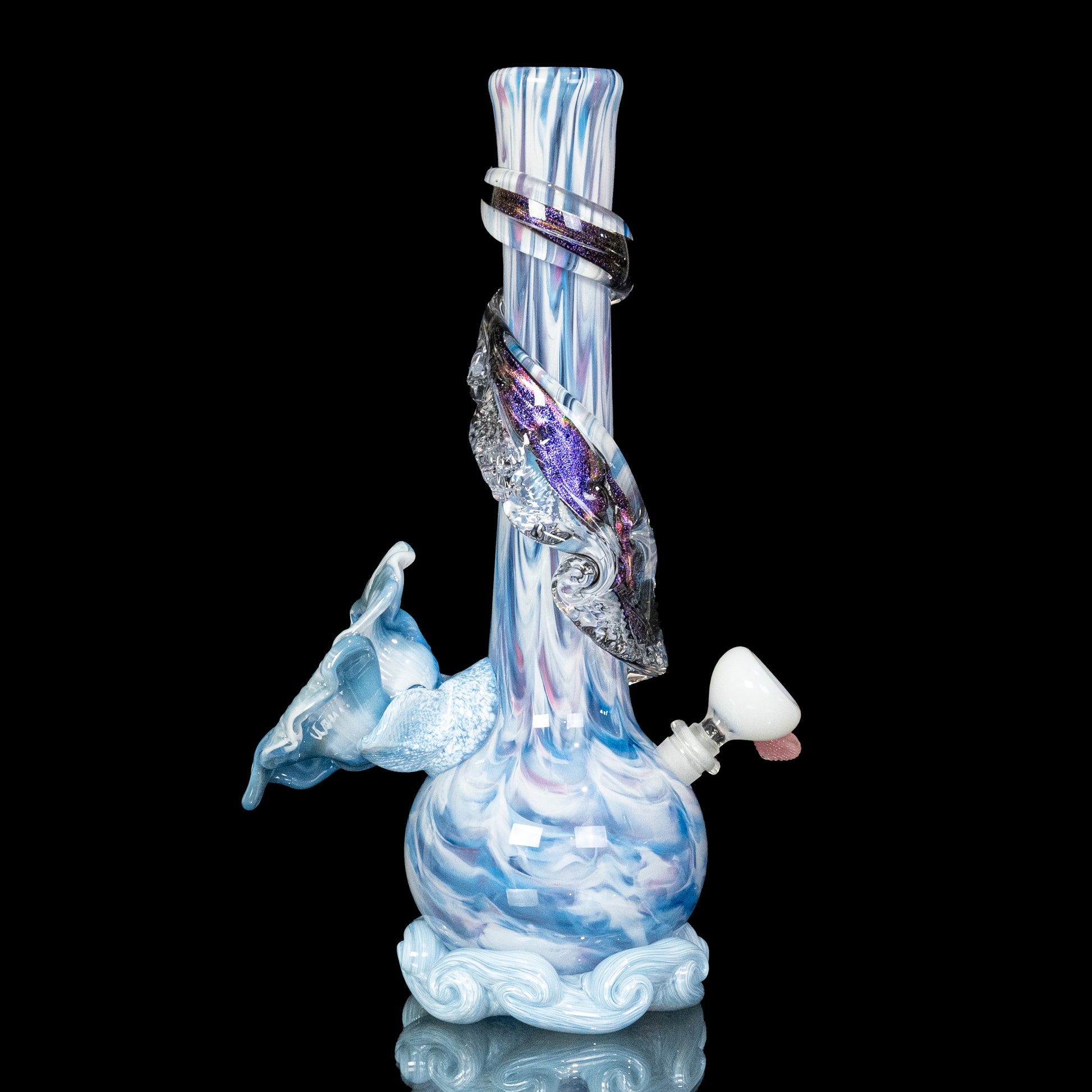 This limited edition soft glass flower bong features a gorgeous cotton candy colored body, a hand-sculpted sky white soft glass flower, AND a stunning blue dichroic soft glass wrap! This cute bong really showcases the versatility of soft glass. Our artisans have spent years honing this technical sculpting process!