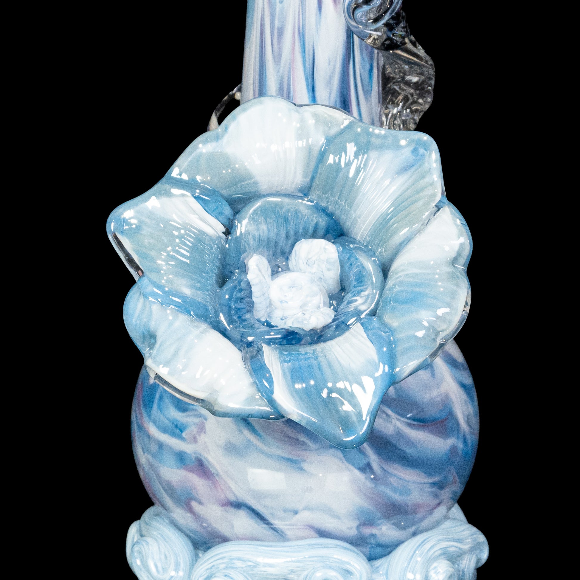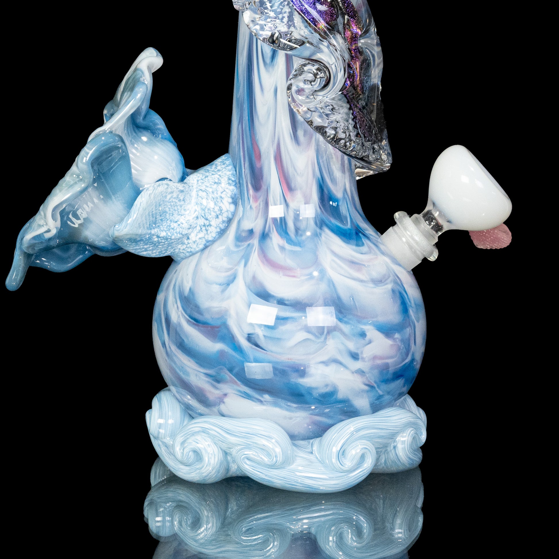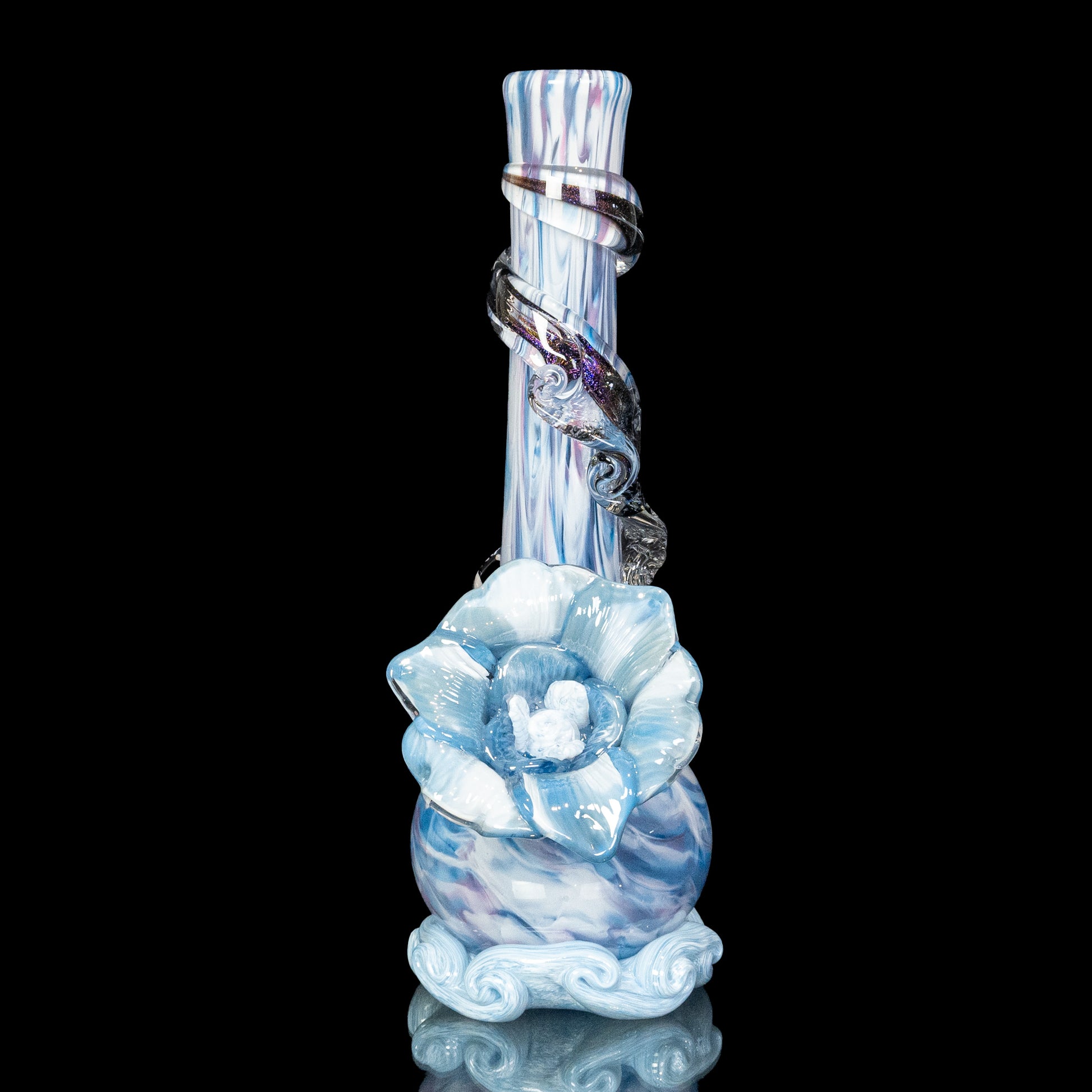 This limited edition soft glass flower bong features a gorgeous cotton candy colored body, a hand-sculpted sky white soft glass flower, AND a stunning blue dichroic soft glass wrap! This cute bong really showcases the versatility of soft glass. Our artisans have spent years honing this technical sculpting process!