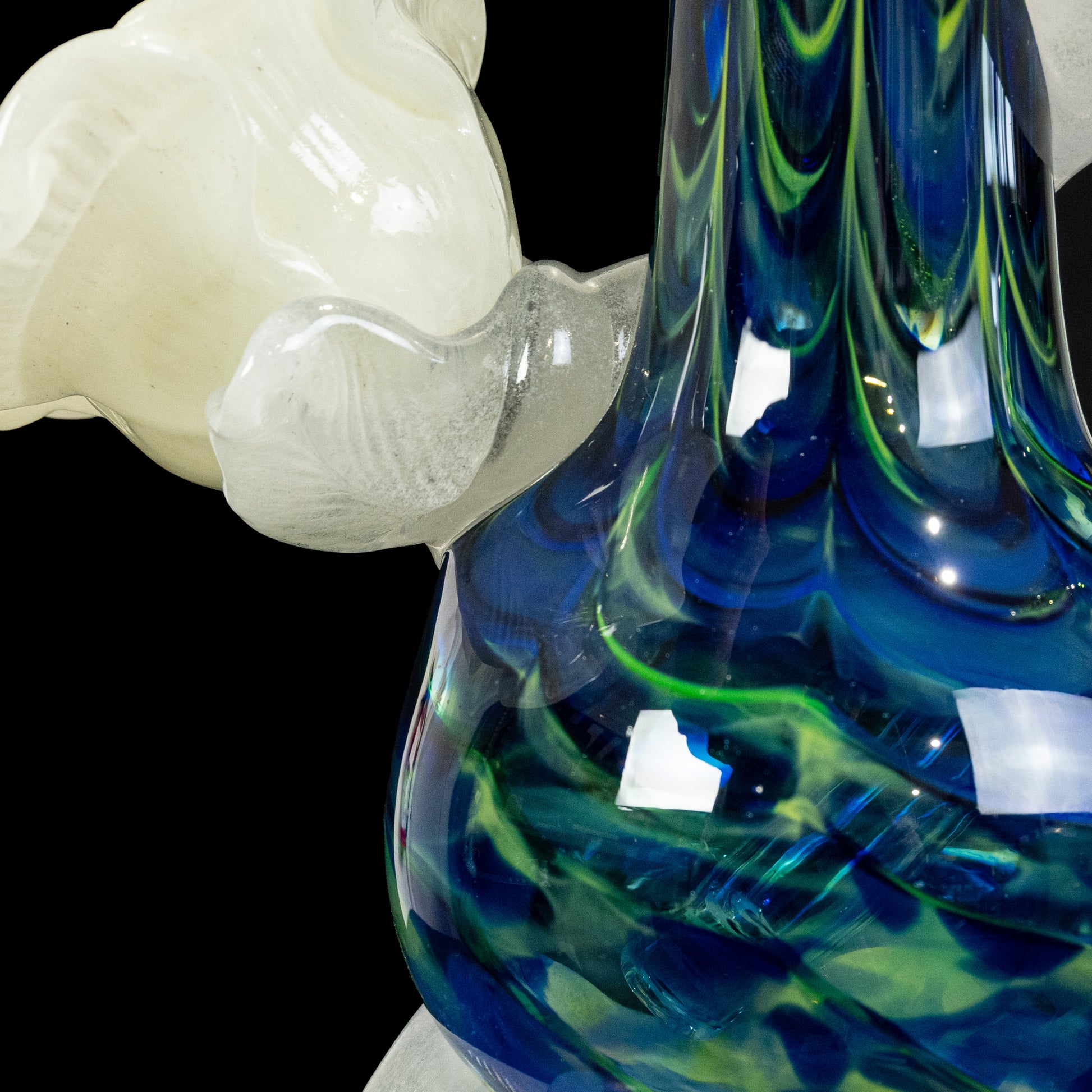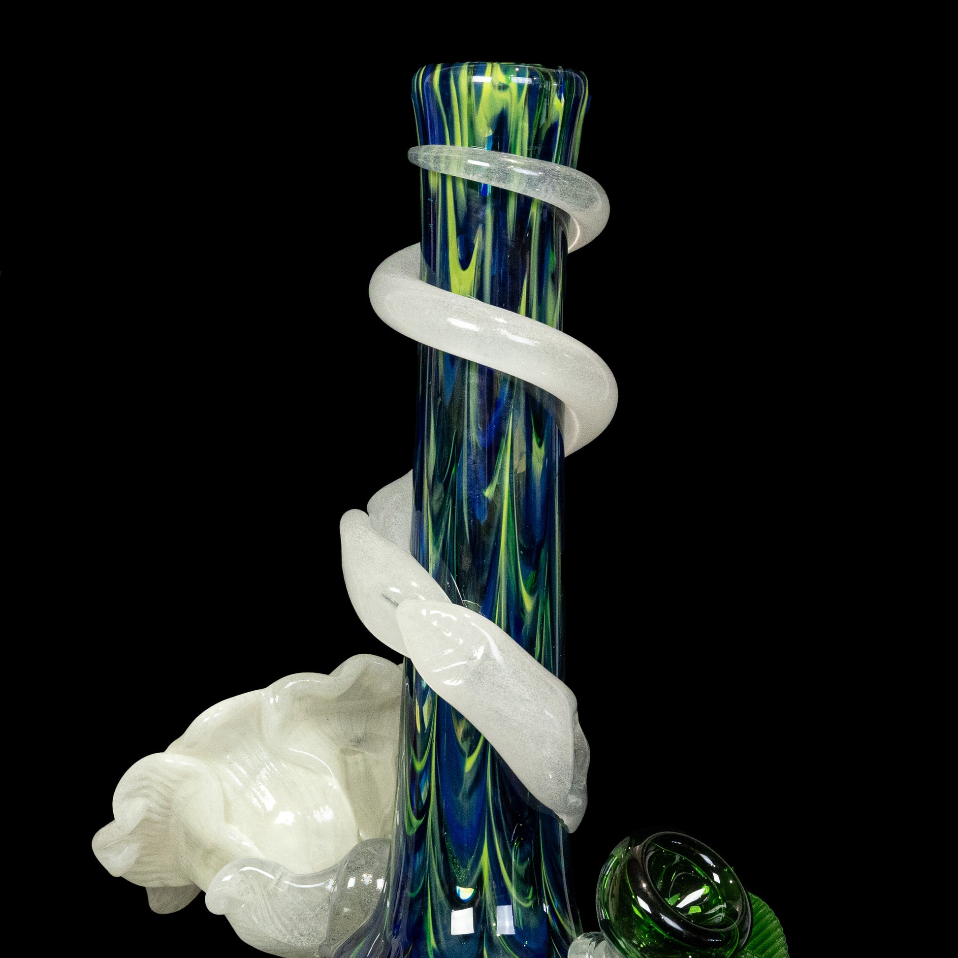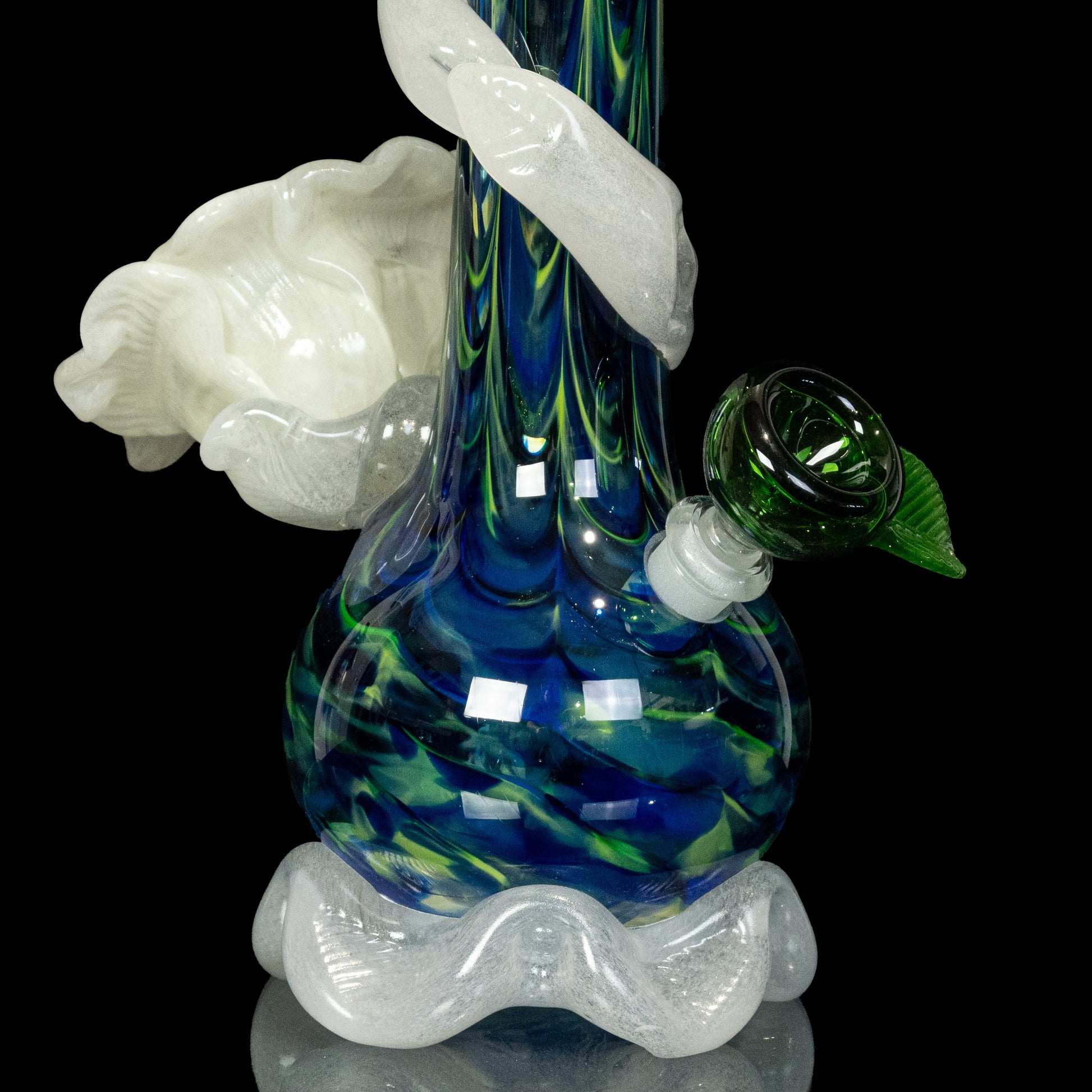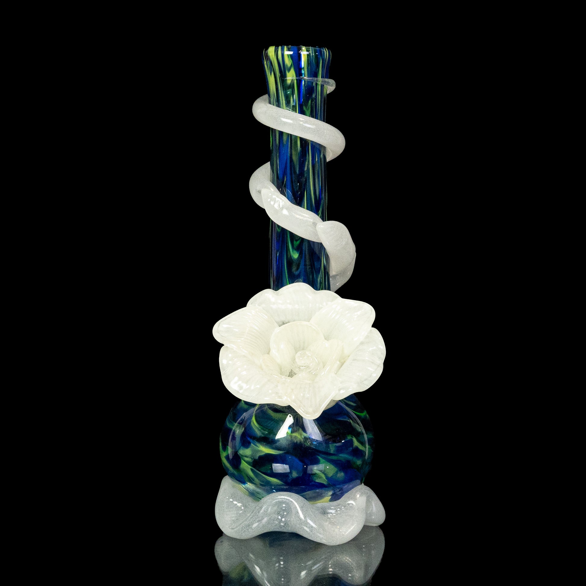 This limited edition soft glass piece features a glow in the dark flower, wrap, and foot. This piece features a beautiful blue and green, dark forest, swirled body. Our artisans craft all of our unique soft glass pieces with the utmost care.
