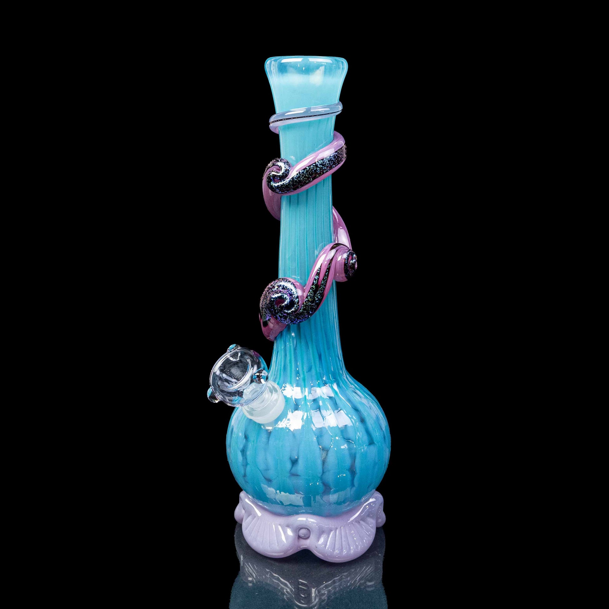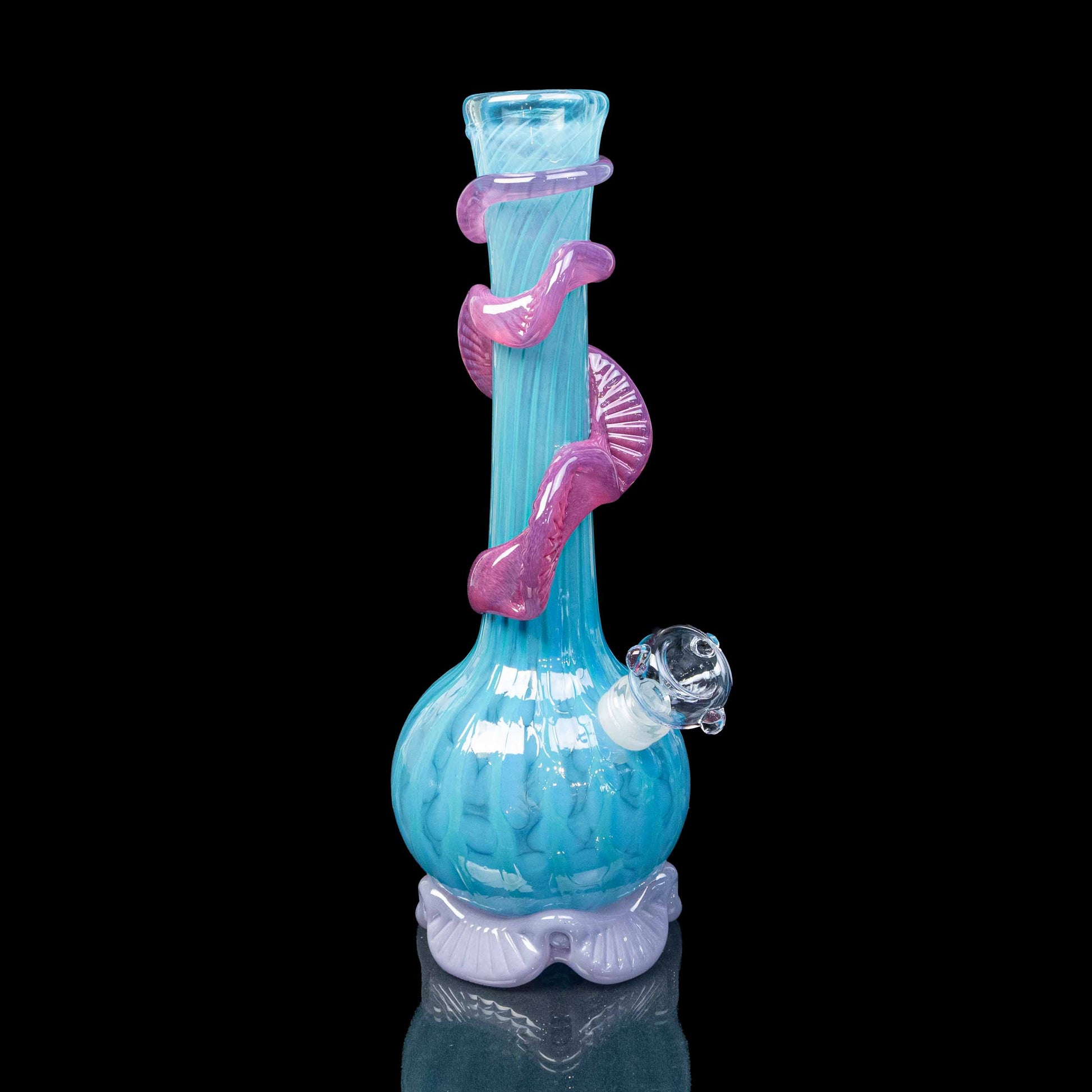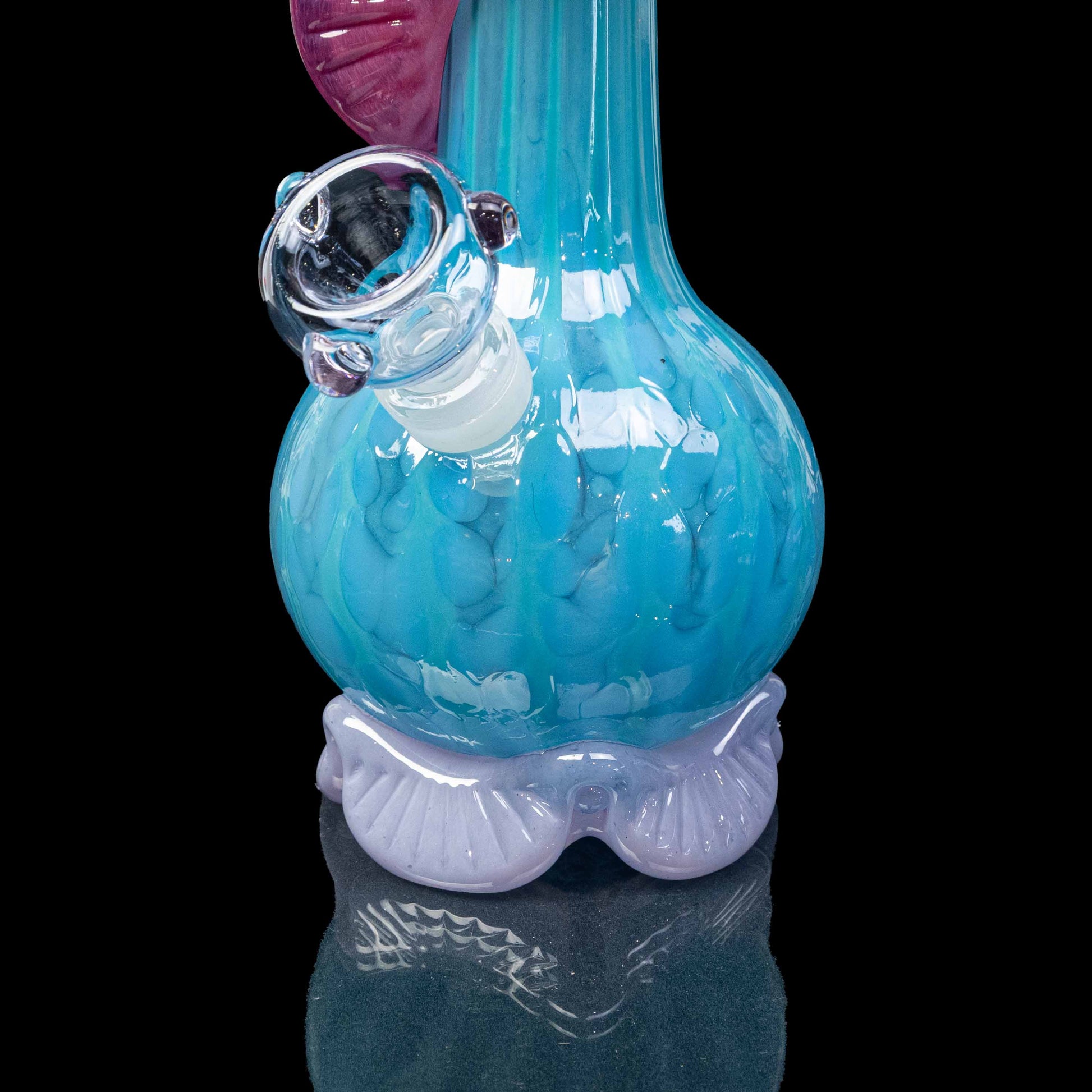 This Little Mermaid inspired bong is a dreamy ocean teal, lavender, and ruby, with soft pastel hues. It is one of the newest color combos to Noble Glass. Its elegant curves and sea-themed shimmer make it a charming, functional piece for anyone who loves mermaid vibes and life under the sea. It is handcrafted in the Original Soft-Glass Style.