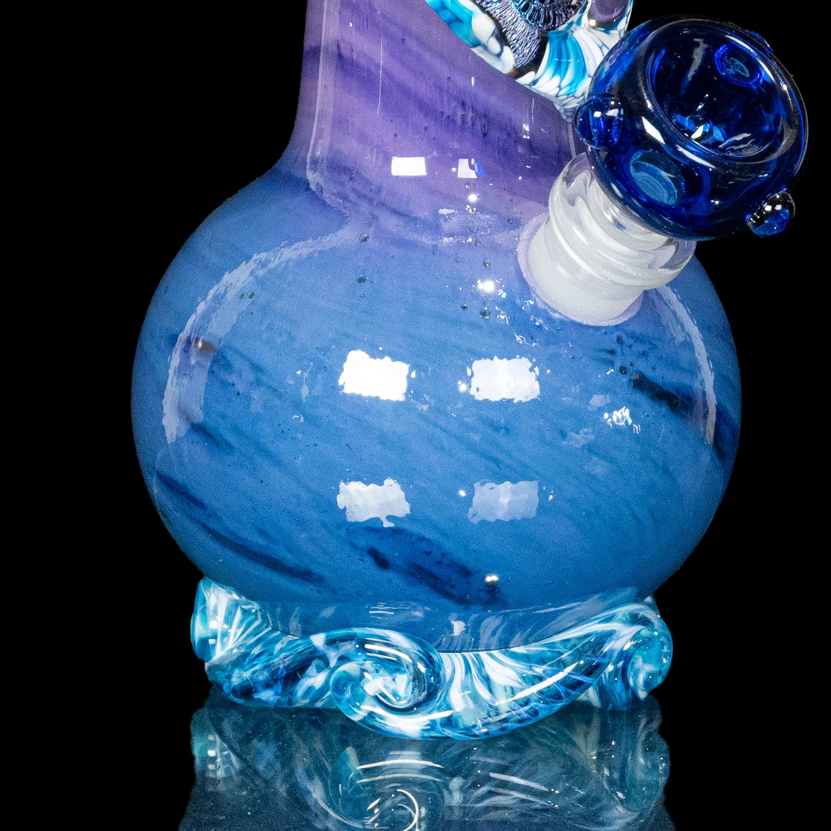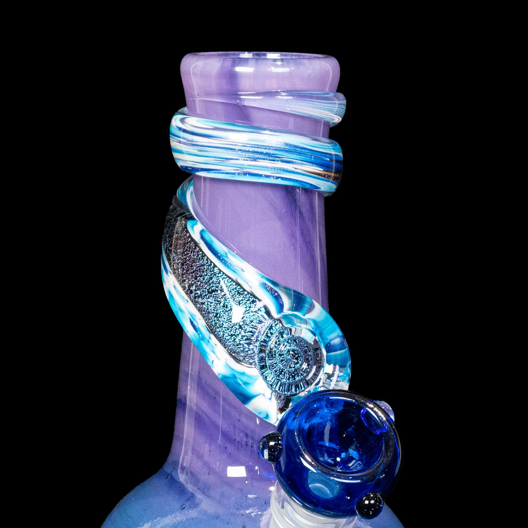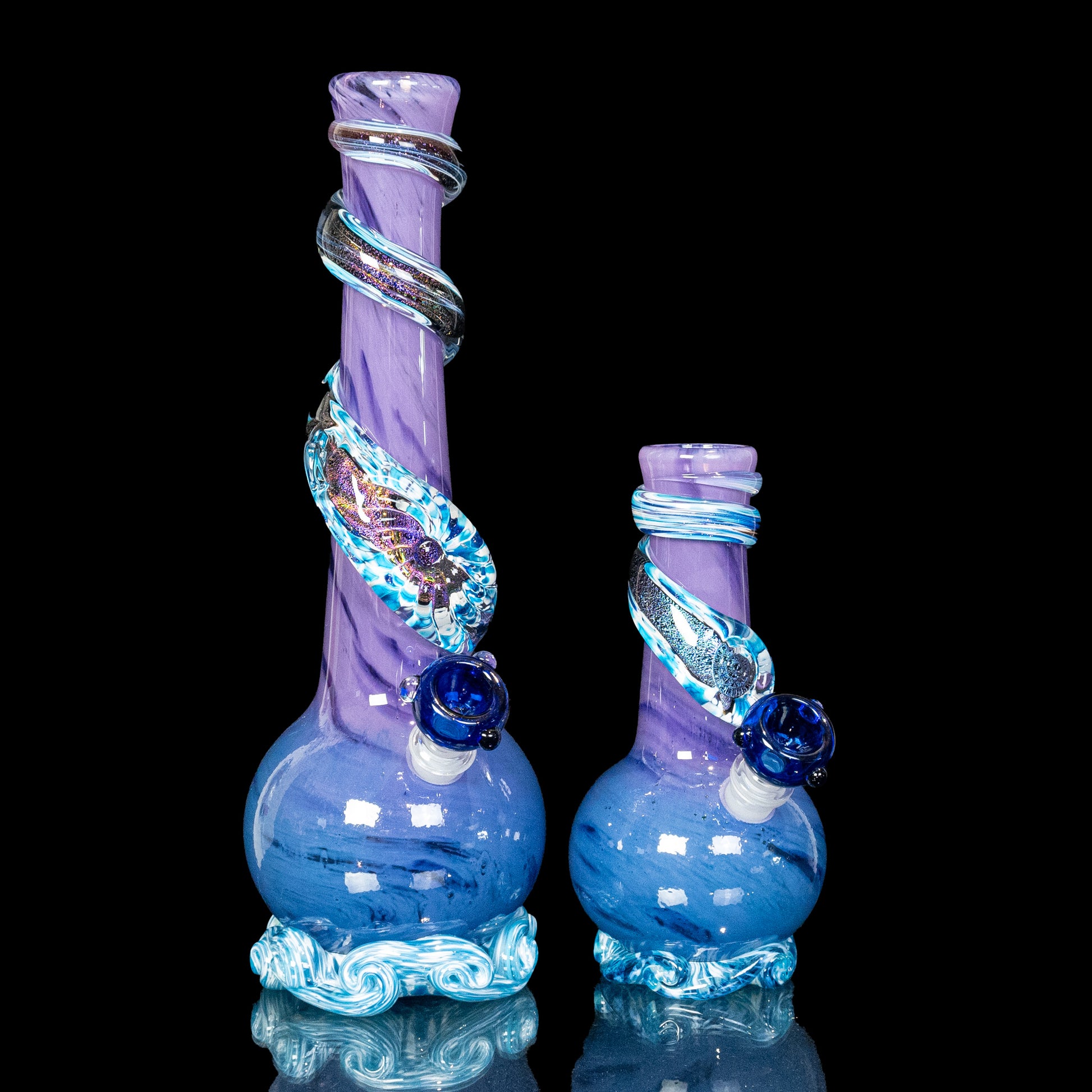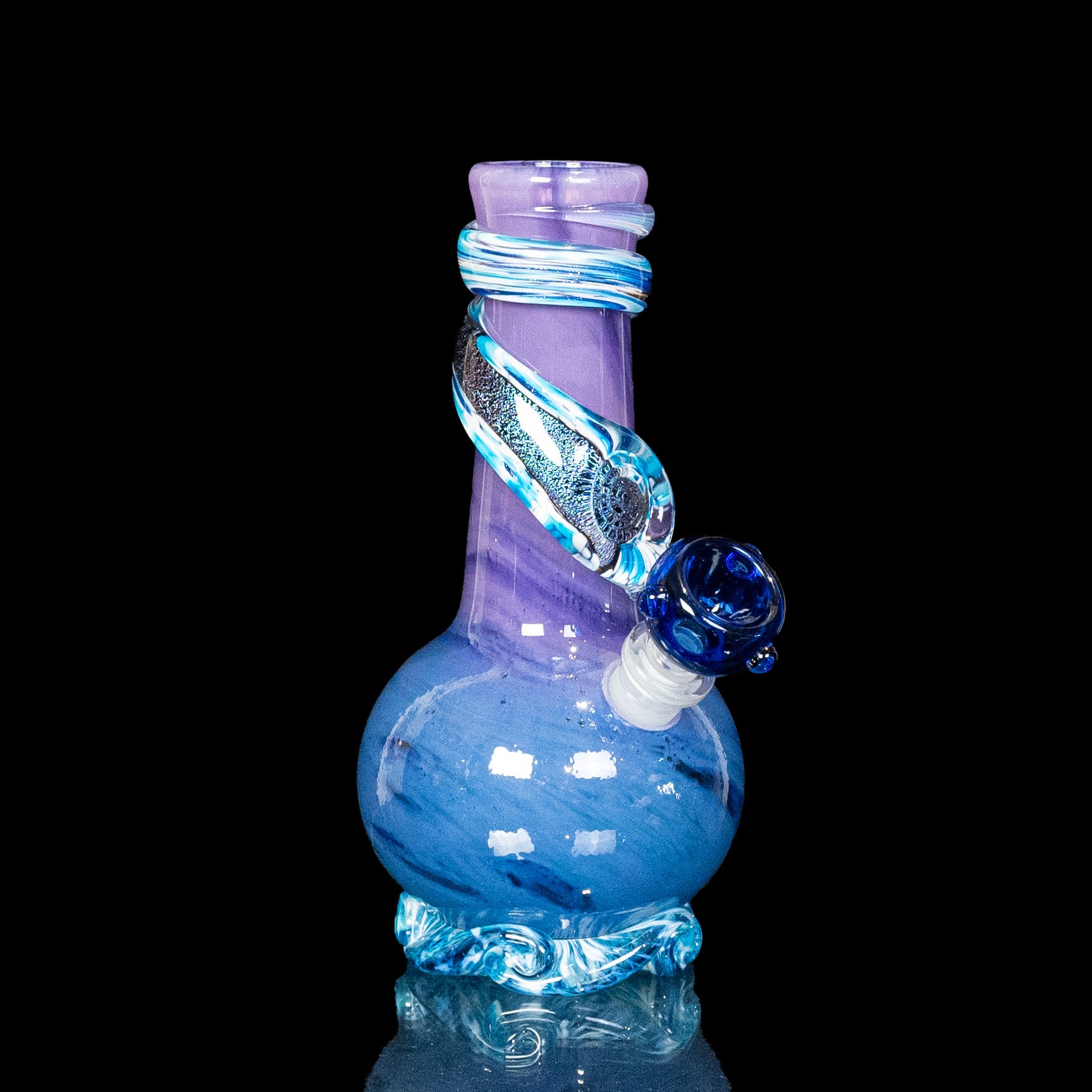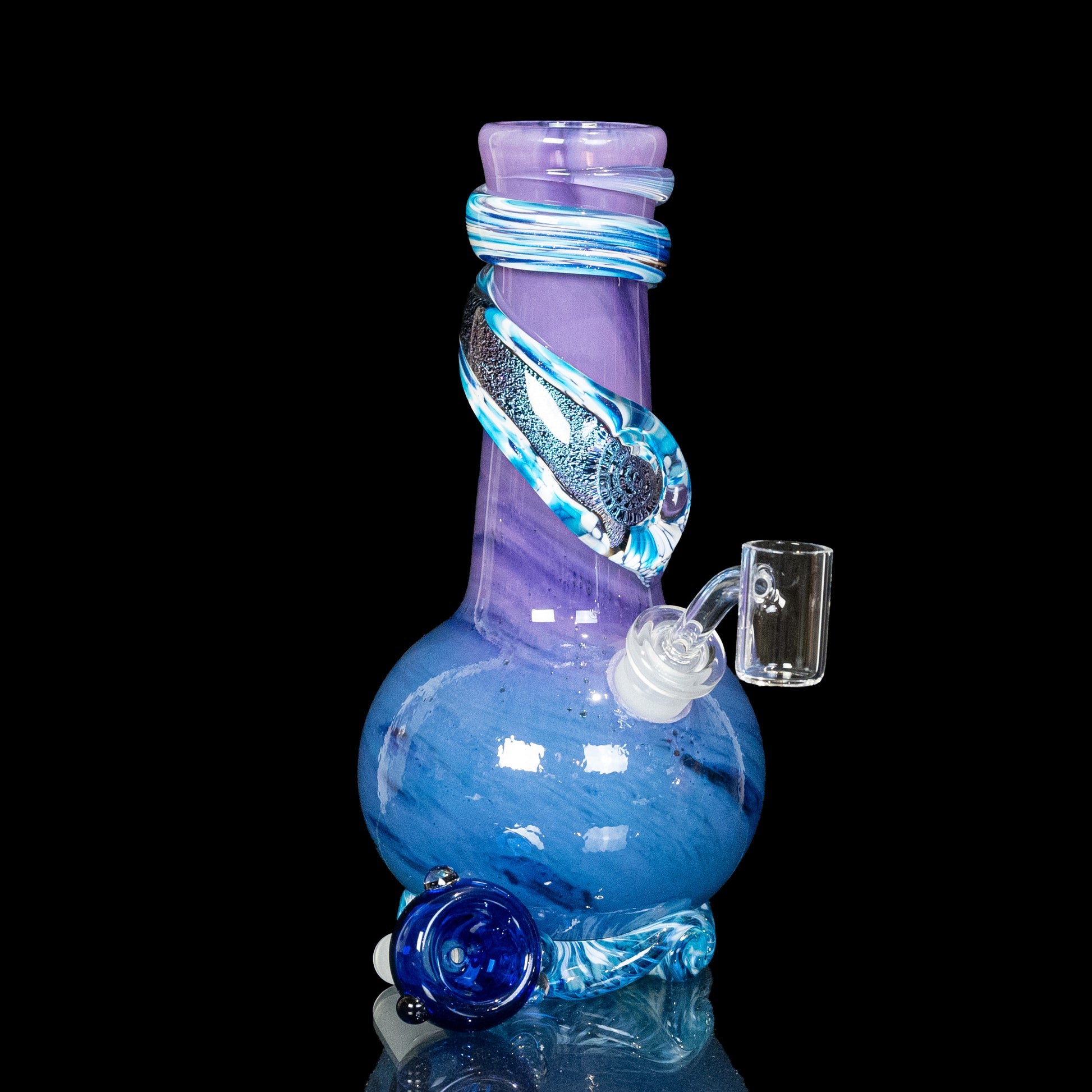 The Mini version of our top selling piece is here! Perfect Storm was our best selling bong in 2024, and continues to be a top fan favorite. Now, you can have it in miniature form! The purple, teal, and dark blue color scheme is the 'perfect' combo. Add in the magenta-blue dichro wrap and sparkling blue aventurine, and it's no secret why this is such a sought-after mini bong. This mini bong also comes with a banger, turning it into a heady dab rig if that is your preferred way to smoke.