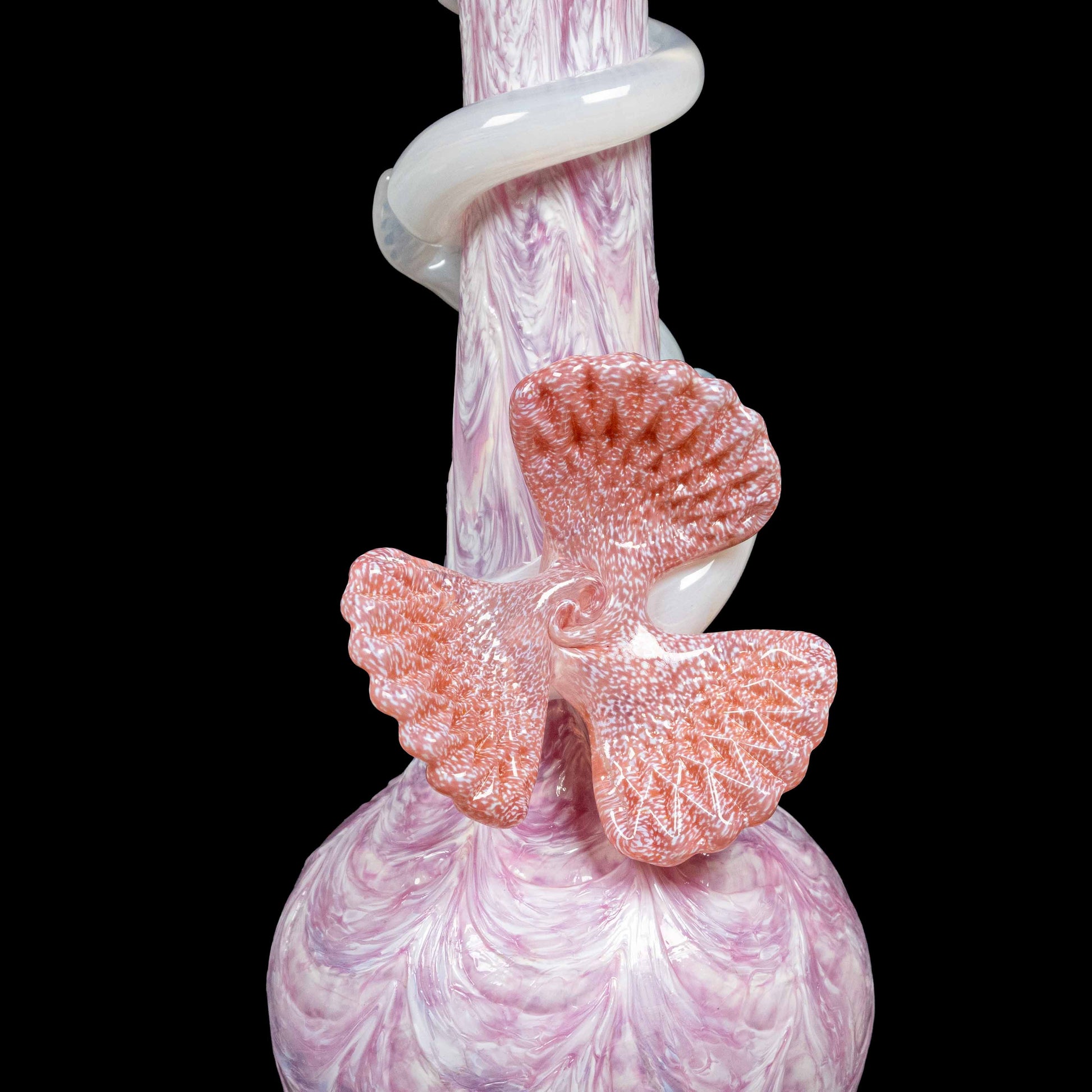 This unique 3 petal pulled flower bong has a pastel pink lace body, an enamel white foot, and a Gold Ruby pulled flower fading into an enamel white wrap. One of the newest flowers in our collection, we are blown away by the contrast in color.