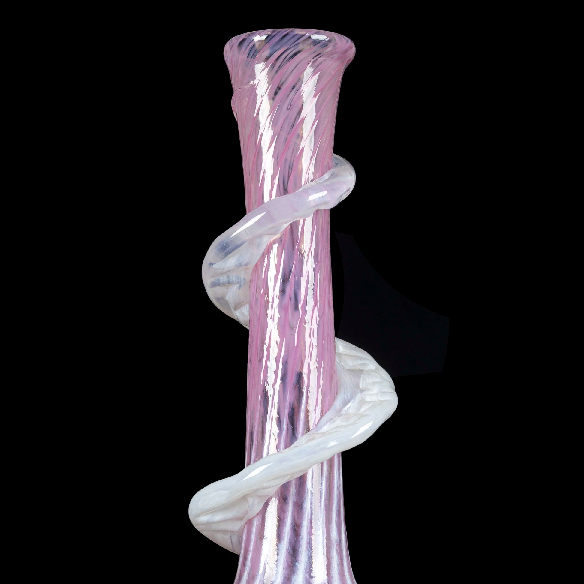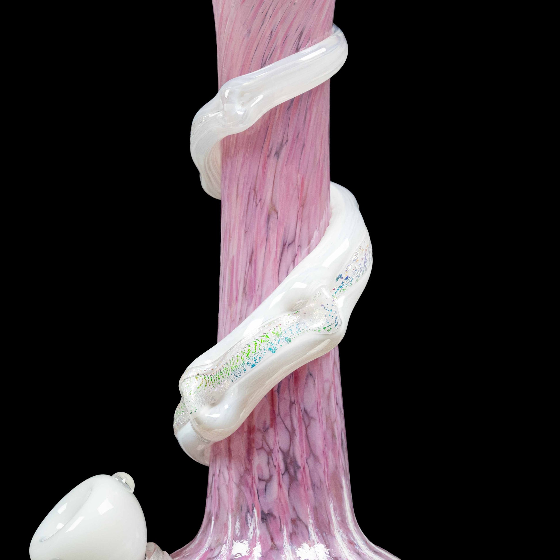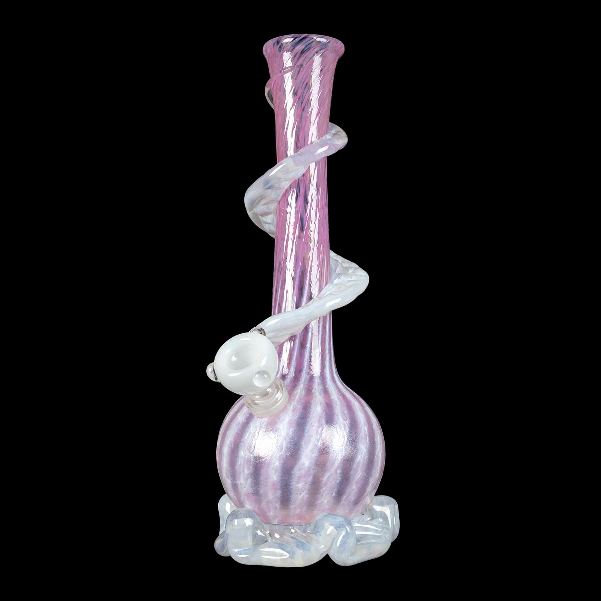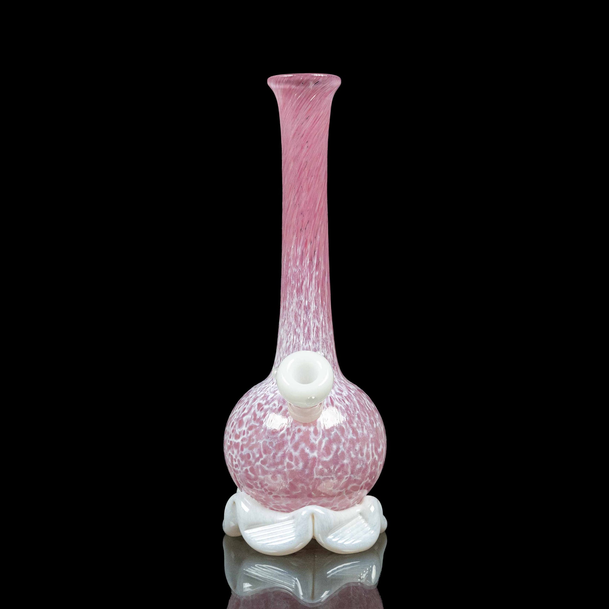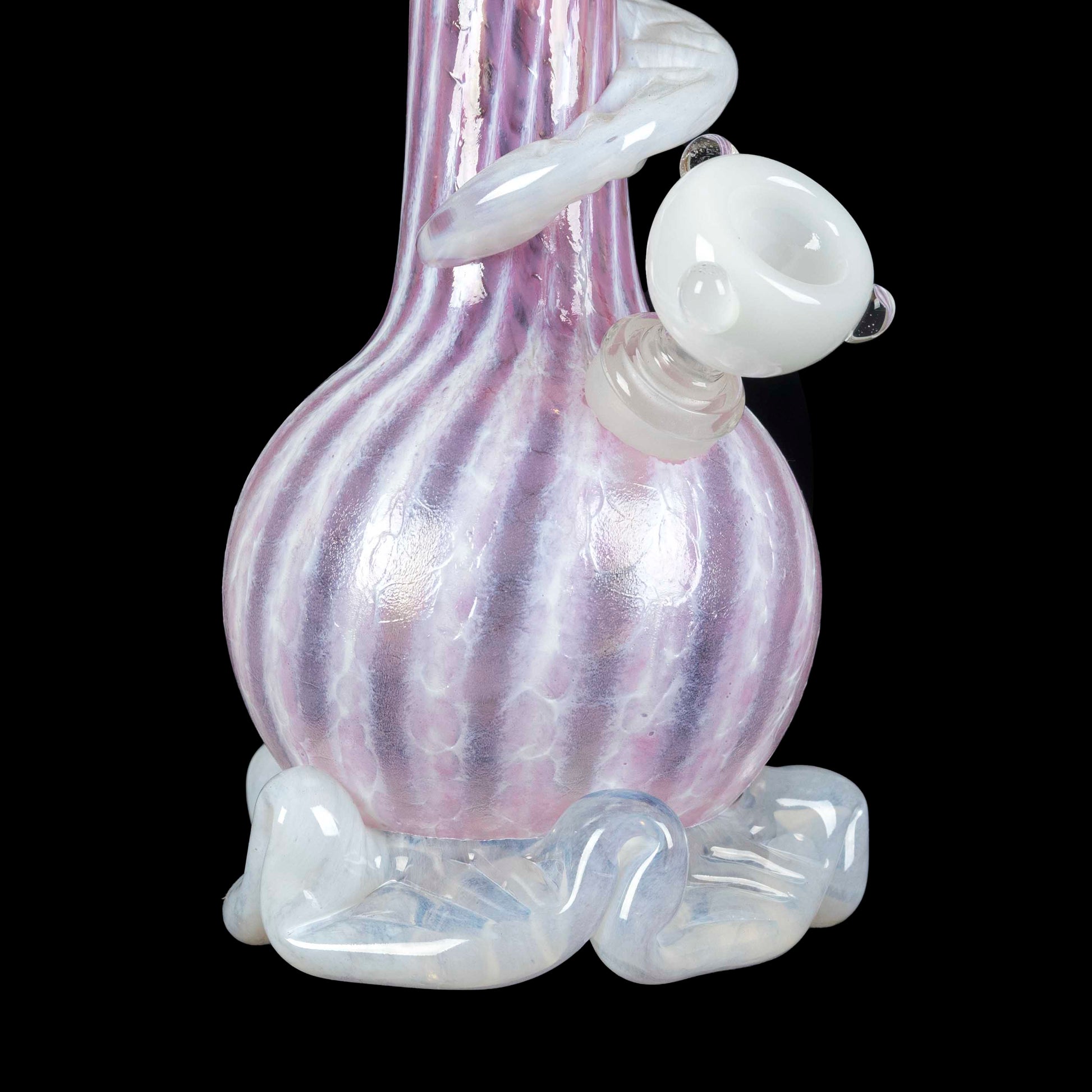 This pretty pink and white bong makes a stylish addition to our collection of pink, and feminine-colored pieces. It has a beautiful, white striping, with translucent windows of pink in between the stripes. Noble Glass is known for having the best variety and quality, of pink and feminine-colored pieces. Pretty In Pink is handcrafted in the Original Soft-Glass Style.