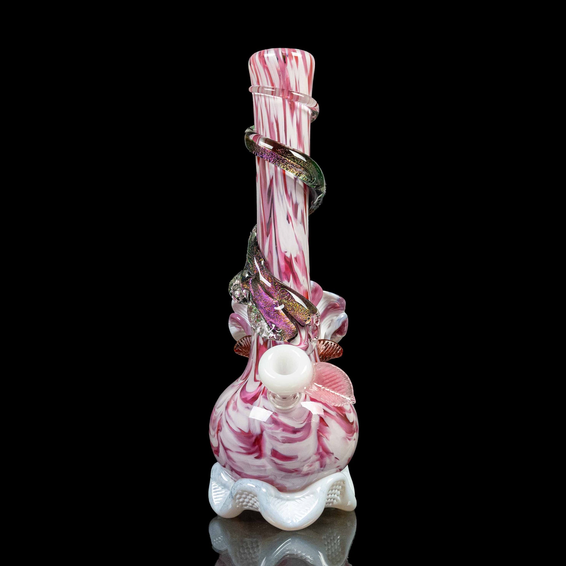This limited edition soft glass bong features a gorgeous ruby-colored body, a hand-sculpted ruby/ white soft glass flower, AND a stunning multi-colored dichroic wrap! Our artisans have spent years honing this technical sculpting process!