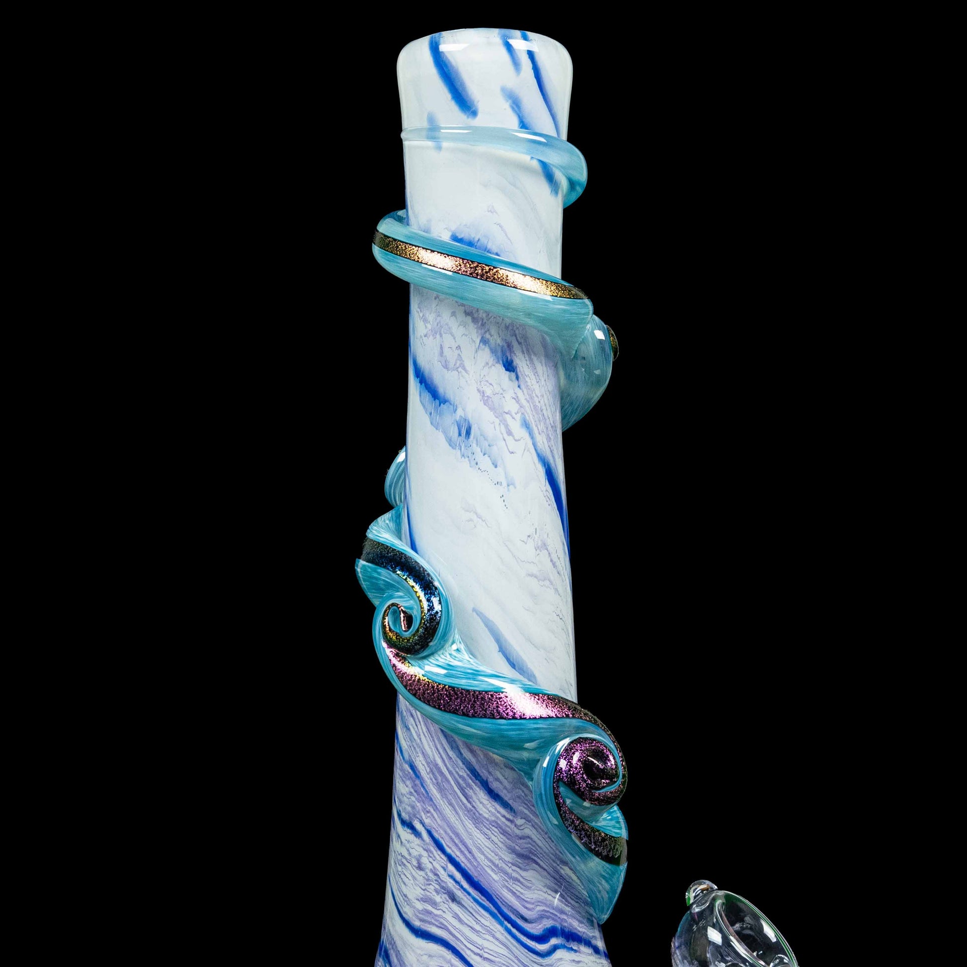 Violet Sunset showcases a mesmerizing pink‑purple dichro swirl that seems to glow from within, accented by ribbons of teal that curl gracefully around the chamber. This teal and purple bong highlights the artisan’s skill as the dichroic coating shifts hues with every angle, creating a dynamic play of light. The smooth curves and translucent walls draw the eye to the vibrant swirls, while the sturdy base ensures stability. Violet Sunset is as much a work of art as it is a functional glass piece—bringing the beauty of a twilight sky straight to your collection.